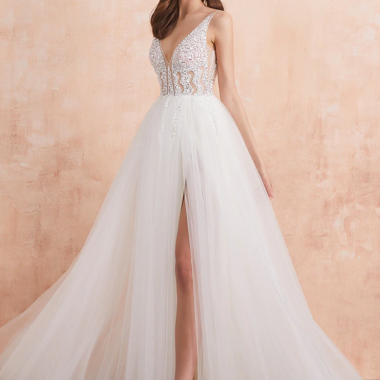 Une robe de mariée avec un corset transparent Portez cette sublime robe de mariée au corset transparent le jour de votre mariage pour être de loin la plus belle. En portant un modèle aussi séduisant et au tissu très fin, vous obtenez la garantie de mettre en avant vos atouts en toute délicatesse. Le bustier…