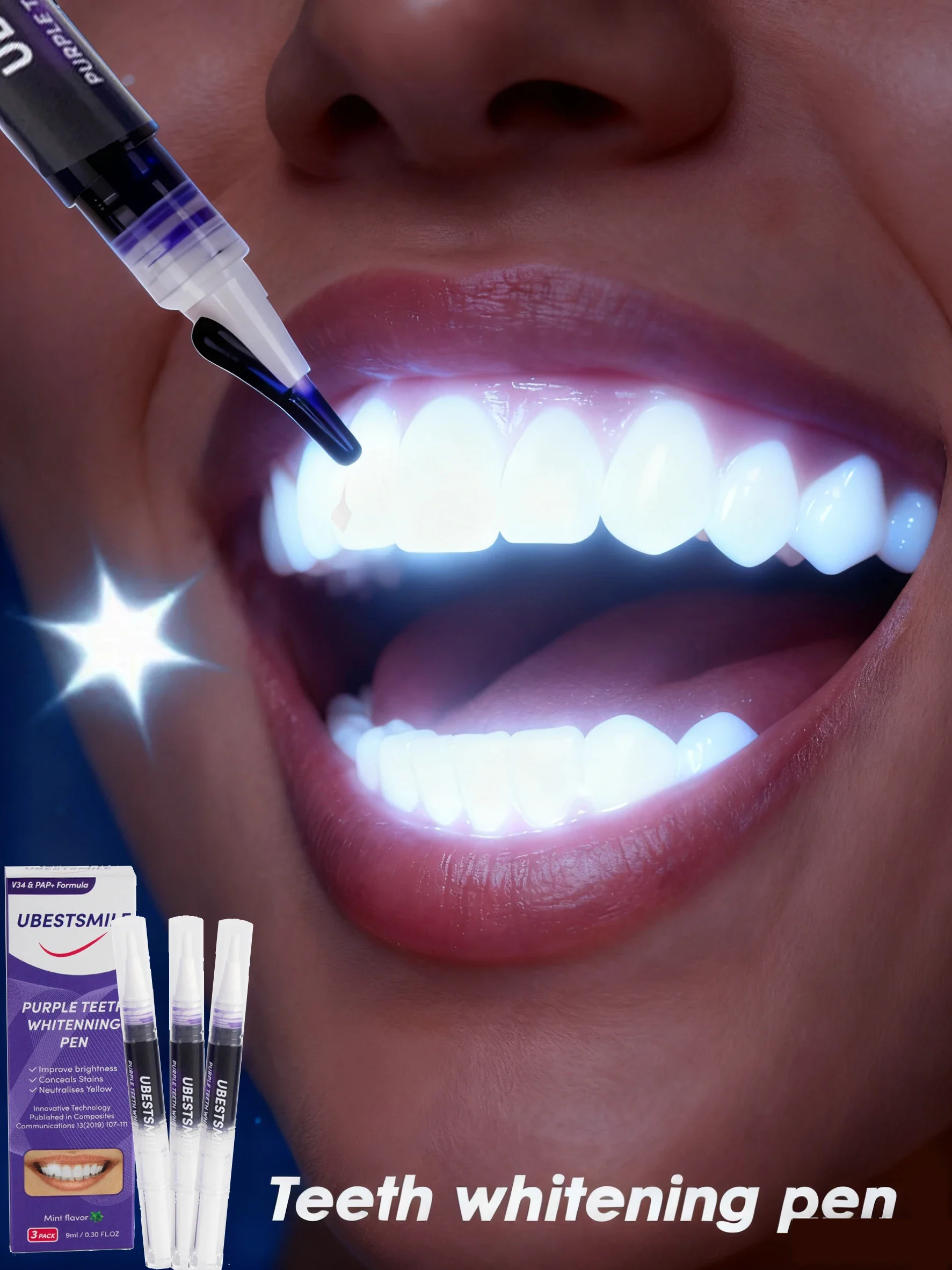 Stylo blanchissant instantané violet pour les dents.